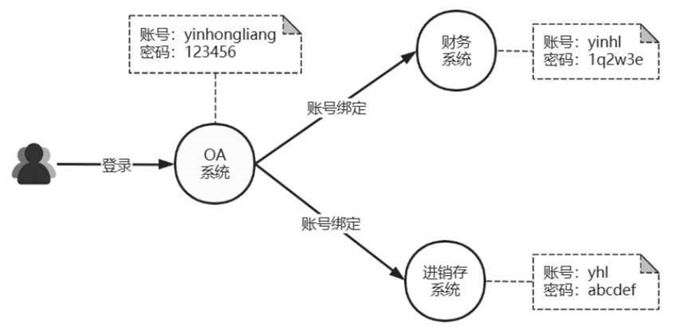单点登录简单绑定模式如图4-41所示。例如,用户在OA系统的账号为yinhongliang,在财务系统的账号为yinhl,在进销存系统的账号为 yhl,密码也各自不同。 如果想登录OA系统,就可以访问财务系统和进销存系统,则必须建立账号绑定关系,一个账号要能绑定多个系统账号(常见的绑定QQ号、微信号、微博账号,都是类似的原理)。