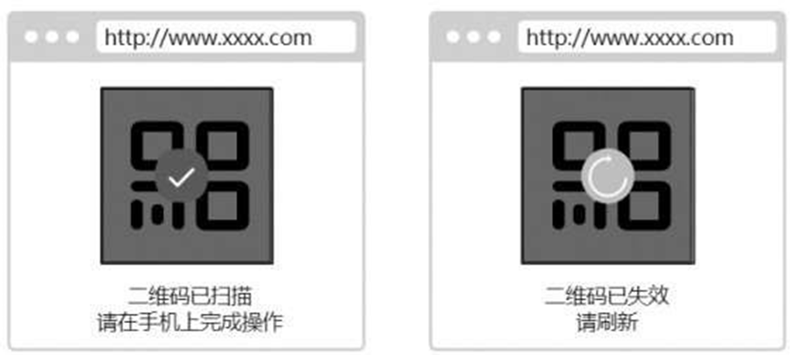 (6) 第1.6~1.8步:浏览器页面再使用qcode不断地去轮询二维码服务,查询当前二维码的状态是什么。如果状态为已扫描,则页面显示二维码已扫描;如果状态为已失效,则页面提示二维码已失效,如图4-52所示。