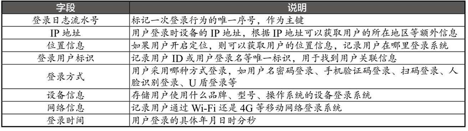 登录日志记录表的结构如表6-1所示,可以采用关系型数据库、文档型数据库进行存储。