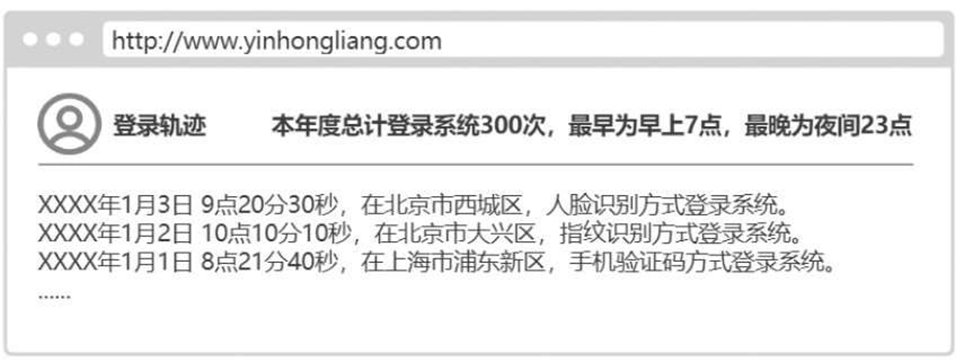如果用户可以查看自己近1个月、近3个月、近1年的系统登录情况(登录日志由于数据量较大,因此一般仅需要提供近1个月的登录情况,最长不超过1年),并形成完整的时间轴轨迹,甚至可以看到自己的本年度统计信息,如总计登录系统次数、最早和最晚登录时间等,这会给用户带来一种成就感,提升用户体验。用户登录轨迹信息如图6-4所示。