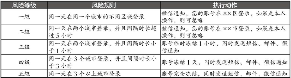 例如,用户一天之内在两个城市登录基本可判定为低风险,而在两个以上的城市登录则判定为高风险,不同的风险等级可以触发不同的执行动作。