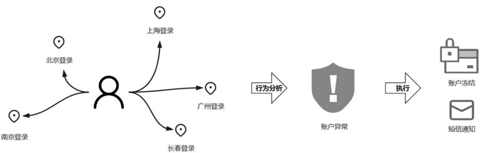 通过对用户登录行为的分析,判定账户异常,从而触发账户冻结和短信通知操作。如图6-1所示,如果一个账号同一天之内在多个城市登录是违反常识的。例如,上午10点在北京登录,11点在上海登录, 12点又在长春登录,经过分析就可以判定用户账号异常,从而触发账号冻结操作,将当前登录用户全部踢出,同时给用户发送短信、邮件、微信等消息通知,告知账号由于在多地登录,存在安全隐患而被冻结,以及如何申请解冻。