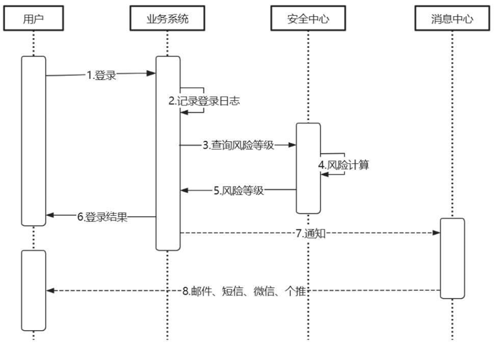 登录风险检测流程如图6-2所示。整个安全检测过程共涉及业务系统、安全中心和消息中心3个服务,用户在登录业务系统时,第一件事就是记录登录日志。然后去安全中心查询账号的安全状态。安全中心根据用户的登录日志实时计算用户本次登录的风险等级,并反馈结果。如果风险等级较低,则允许登录,否则冻结账号。根据不同的风险等级可能会给用户发送邮件、短信、微信、个推等消息通知,整个过程异步完成。