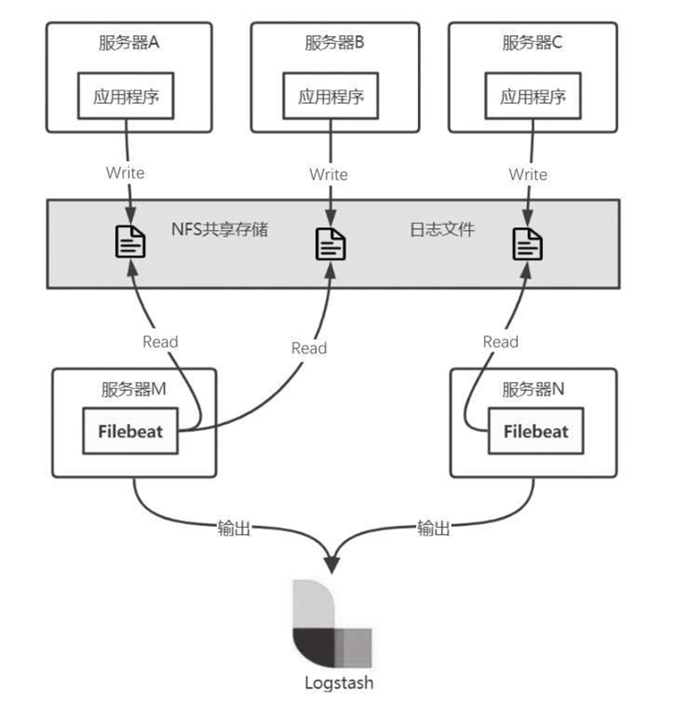 第二种部署方式如图6-37所示,将所有的日志通过NFS共享存储在一起,然后部署一台或多台独立的Filebeat服务器。这种部署方式的优点是可以独立部署Filebeat服务,与应用程序分离,即使Filebeat对资源消耗较大,也不会影响到业务应用的运行。