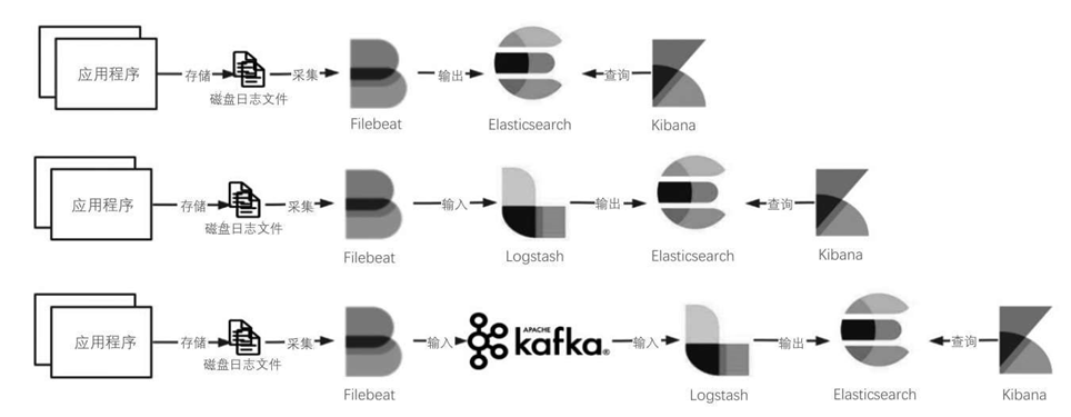 Logstash或Kafka中,因此在前3种架构之前加入Filebeat,就可以形成3 种新的架构模式。