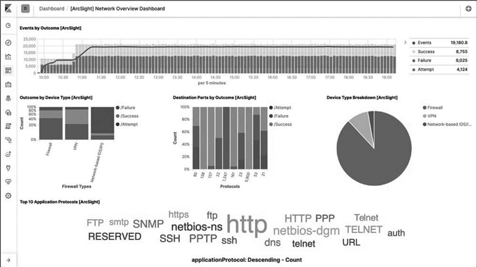 Kibana是一个十分强大的可视化工具,可以使用柱状图、线状图、饼图、热力图等形式按照不同维度统计日志信息,也可以自己定制化各种仪表盘,如图6-29所示。