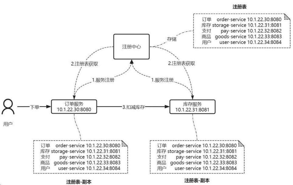 (3)     当订单服务请求库存服务时,会先从注册中心获取注册表信息,查询到库存服务(storage-service)所对应的IP地址和端口(10.1.22.31:8081),然后订单服务会直接使用此IP地址和端口去访问库存服务,从而完成接口交互。