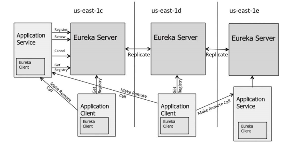 以Eureka注册中心高可用架构为例,如图3-16所示,Eureka Server 为注册中心的服务器节点,它们可以分别部署在不同的数据中心。例如,us-east-1c代表美国-东-1c数据中心,us-east-1d代表美国-东-1d数据中心。多个Eureka服务之间采用复制机制(Replicate),都存储着全部