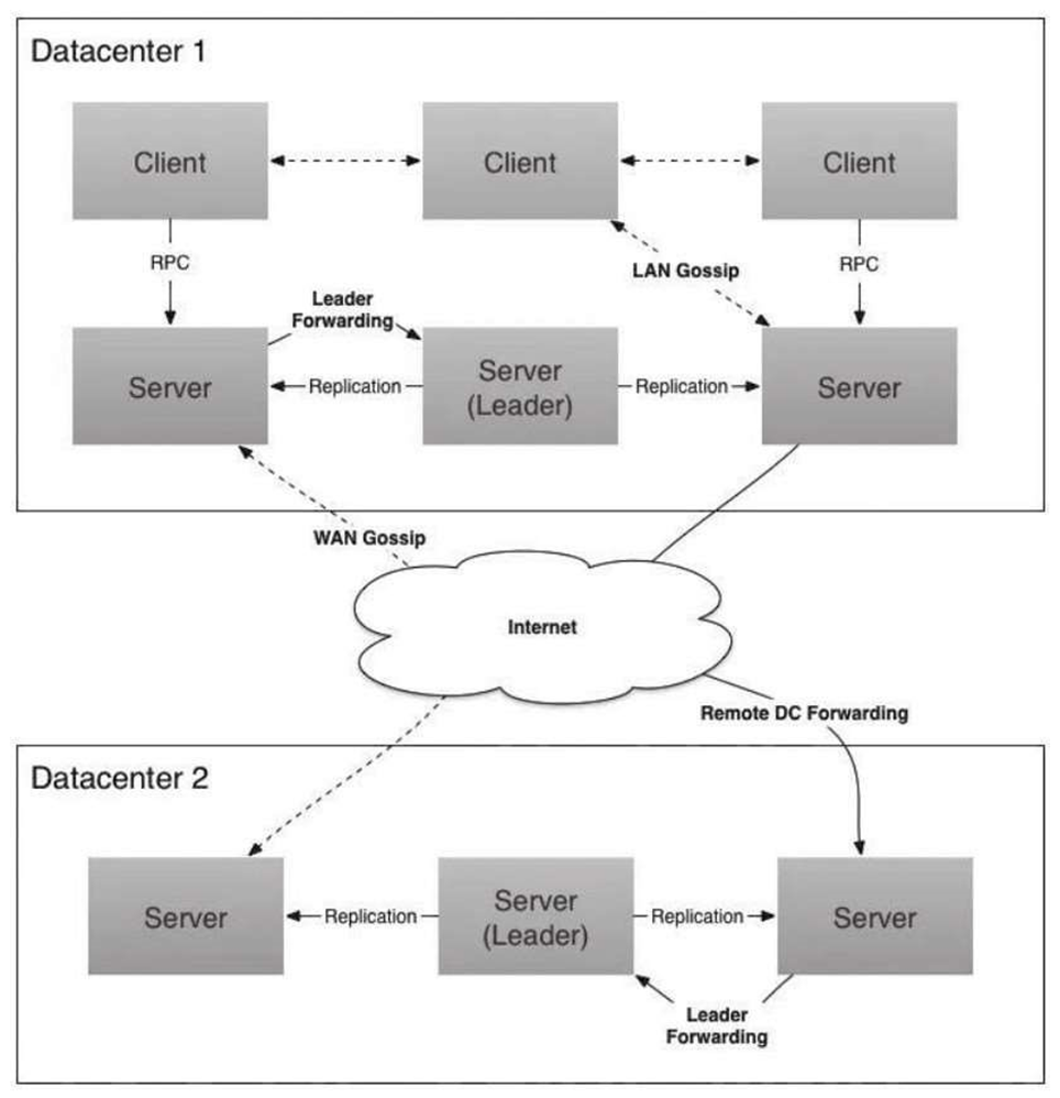以Consul注册中心高可用架构为例,如图3-17所示,Datacenter 1、Datacenter 2分别代表两个数据中心,每个机房都部署了3个Consul Server注册中心服务,3个服务之间保持着数据复制(Replication),同时使用选举算法(Leader Forwarding)组成1个Leader(主节点)和2个 Slave(从节点)的高可用架构。Datacenter 1、Datacenter 2两个数据中心之间通过互联网进行访问,从而形成了多数据中心的高可用架构。